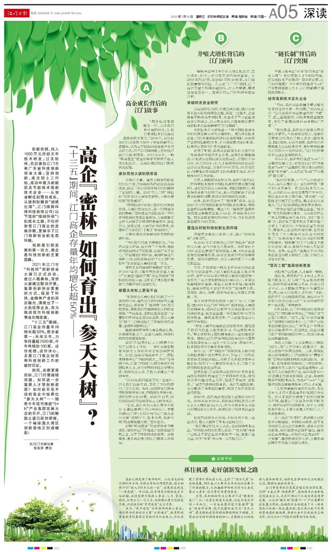 臥薪嘗膽,投入1500萬(wàn)元?dú)v經(jīng)五年技術(shù)研發(fā);過(guò)關(guān)斬將,先后參加江門(mén)市和廣東省科技創(chuàng)新創(chuàng)業(yè)大賽;堅(jiān)持創(chuàng)新,成立院士工作站,成功申報(bào)為新能源及節(jié)能技術(shù)高新技術(shù)企業(yè)……從創(chuàng)業(yè)孵化到茁壯成長(zhǎng),從披荊斬棘到“揚(yáng)帆出海”,江門(mén)綠潤(rùn)環(huán)??萍加邢薰荆ㄒ韵潞?jiǎn)稱“綠潤(rùn)環(huán)保”)的成長(zhǎng)之路,不僅折射著江門(mén)高企的發(fā)展歷程,更展示了江門(mén)創(chuàng)新創(chuàng)業(yè)的生態(tài)環(huán)境。創(chuàng)新是引領(lǐng)發(fā)展的第一動(dòng)力,高企是科技創(chuàng)新的主要載體。
